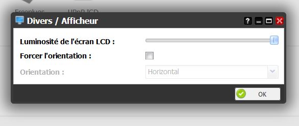 Double-cliquez dessus et vous aurez ainsi la possibilité de régler la luminosité de l’écran LCD de votre Server Freebox Révolution. Si vous souhaitez voir l’inscription disparaître complètement, il suffit de mettre le curseur à zéro. D’ailleurs, c’est aussi dans cette section que vous pourrez régler l’affichage si vous placez votre Server à la verticale.