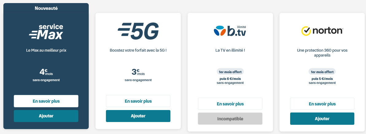 Service Max a pour elle son prix plutôt alléchant par rapport à son contenu. Alors que l’activation de la 5G coûterait 3€ supplémentaire par mois et l’accès à B.TV illimité, 6€/mois, ici l’option n’est facturée que 4€/mois tout en incluant cette assistance poussée qui n’est pas proposée seule. Sur le papier, il est donc plus intéressant de prendre Service Max, d’autant plus que cette formule est sans engagement et peut donc être résiliée à tout moment. Pour rappel, cette option n’est disponible que sur les forfaits sans engagement de l’opérateur et non pas sur les offres estampillées simplement “Bouygues Telecom”.