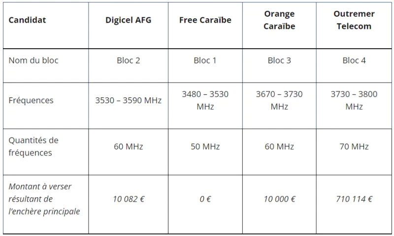 L’ARCEP vient de publier les résultats des enchères pour l’attribution de fréquences dans la bande 3,4 – 3,8 GHz en Guyane, à Saint-Barthélemy et à Saint-Martin se sont déroulées le 1er juin 2023. Il en ressort notamment que Free Caraïbe en a obtenu de nouvelles sur tous ces territoires et département d’Outre Mer.