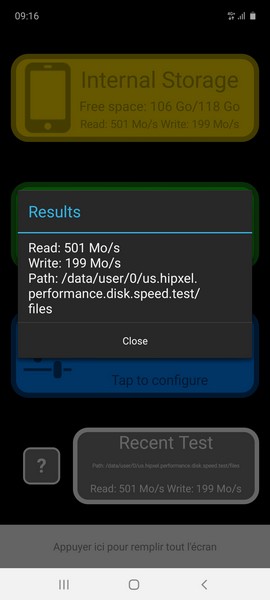 Pour les amateurs de benchmarks, AnTutu positionne le Galaxy A71 à proximité d’un Galaxy S9, soit un ancien haut de gamme de 2018. Disk speed indique de son côté 199 Mo/s en écriture et 501 Mo/s en lecture pour la mémoire interne.