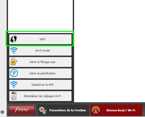 Depuis l’interface Freebox OS, accessible depuis votre navigateur à l’adresse mafreebox.free.fr, allez dans Paramètres de la Freebox et Wi-Fi, puis cliquez sur le bouton WPS en bas à gauche :