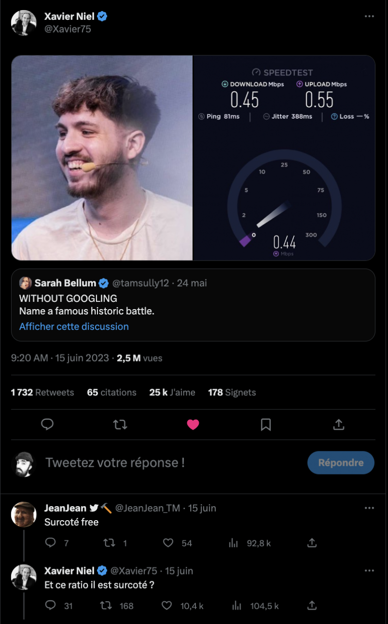 Quand Xavier Niel se remémore sur Twitter avoir volé au secours l’été dernier du streamer et YouTuber Terracid en lui apportant la fibre, un internaute s’est permis en réaction une petite pique : “Surcoté Free”. Toujours aussi cocasse, le fondateur de l’opérateur lui a alors répondu : “Et ce ratio il est surcoté ?”. Le Twittos doit aujourd’hui s’avouer vaincu.