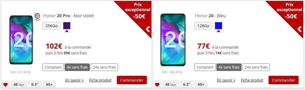 - Le Honor 20 Pro et les Honor 20 bénéficient tous les deux d’une remise de 50€. Leur prix passent donc respectivement à 399€ et 299€ au comptant. La réduction s’applique également en 4x sans frais et en 24x sans frais.