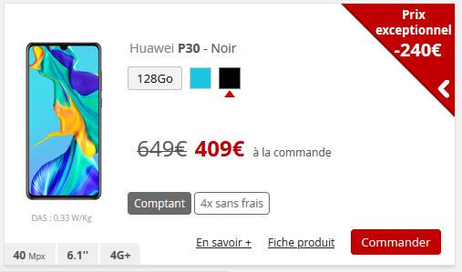 - Le Huawei P30 voit également son prix réduit, avec une baisse de 240€, pour un prix au comptant de 409€. Vous pouvez également vous le procurer en 4x sans frais pour 103€ puis trois fois 102€.