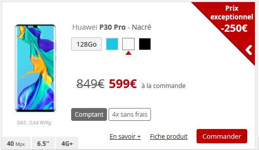 - Le Huawei P30 Pro bénéficie d’une nouvelle réduction de 250€, son prix passe ainsi à 599€ contre 849€ auparavant. Il est disponible en paiement en 4 fois sans frais, pour 152€ à la commande puis 3 fois 149€ sans frais.
