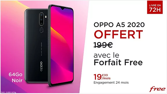 Ce forfait Forfait Free Veepee est proposé au tarif habituel, soit 19,99€/mois ou 15,99€/mois pour les abonnés Freebox, mais avec un smartphone OPPO A5 2020 64 Go noir offert (sa valeur est de 199€). L’engagement est de 24 mois et la carte SIM est facturée 10€.. Ce smartphone propose notamment un chipset Snapdragon 665 avec 3 Go de RAM, un écran IPS 6,5 pouces HD+, un quadruple capteur photo au dos et une batterie 5 000 mAh. Le tout orchestré par le système Android 9.0 Pie avec l’interface ColorOS 6.0.
