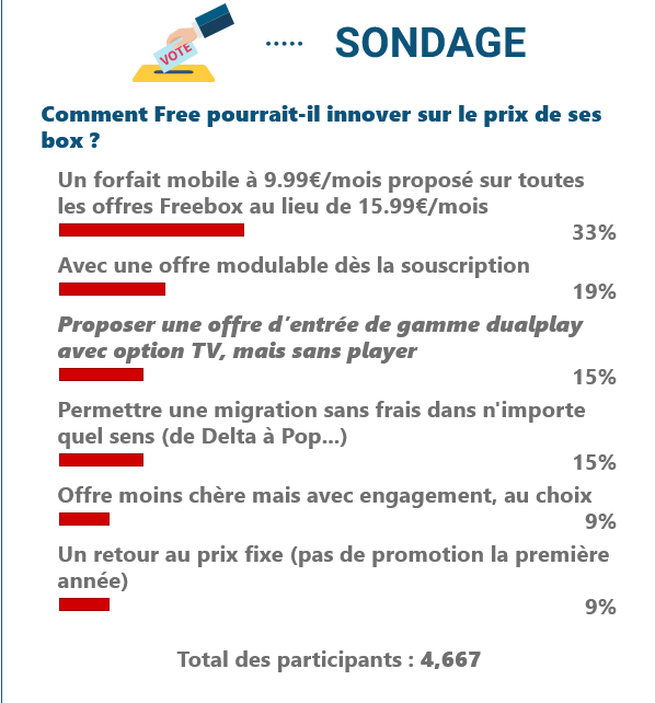 Comment Free peut-il innover sur le prix de ses box ? La question vous a été posée sur le site d’Univers Freebox du 22 mai au 20 juin. Sur les 4667 votants, 33% estiment que Free pourrait se démarquer en proposant son forfait mobile tout illimité à 9,99€/mois sur toutes les Freebox au lieu des 15,99€/mois actuels. Aujourd’hui, seul l’abonnement Freebox Pop permet d’ouvrir une ligne mobile à ce prix défiant toute concurrence.