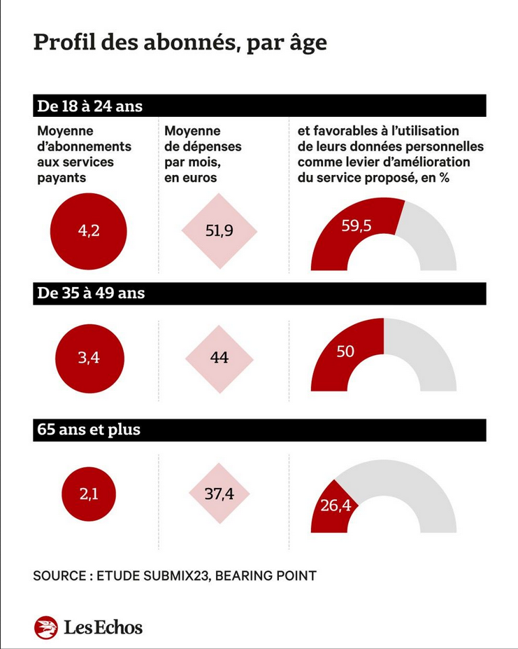 Si le total dépasse de loin les 100%, c’est parce qu’il est plus rare de n’avoir qu’un seul abonnement. Toute catégorie confondue, on compte 3.1 abonnements en moyenne selon l’étude, avec des différences générationnelles notamment du côté des 18-24 ans où la moyenne atteint 4.2 abonnements en 2023.