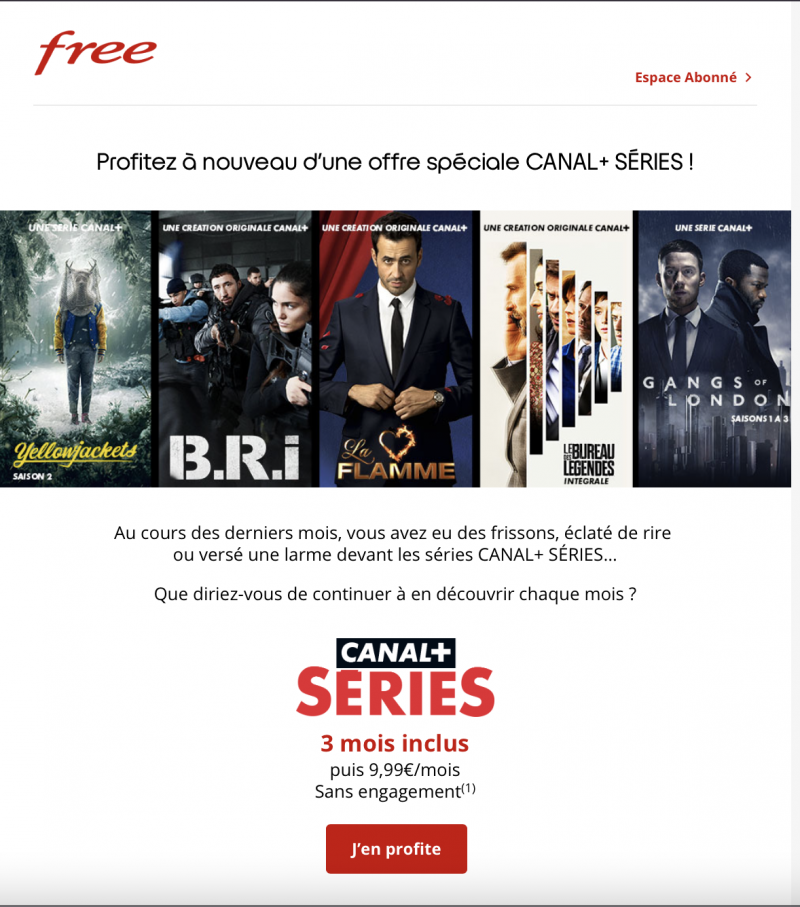 “Au cours des derniers mois, vous avez eu des frissons, éclaté de rire ou versé une larme devant les séries Canal+ Séries… Que diriez-vous de continuer à en découvrir chaque mois ?”, commente le FAI dans son courriel. En revanche, l’offre est réservée aux abonnés qui ne détiennent pas déjà un abonnement à Canal+ Séries, sous réserve d’une souscription avant le 31 décembre prochain. Il faudra donc bien s’assurer qu’une précédente promotion ne soit pas encore en cours avant d’activer celle-ci sur l’Espace abonné Freebox.
