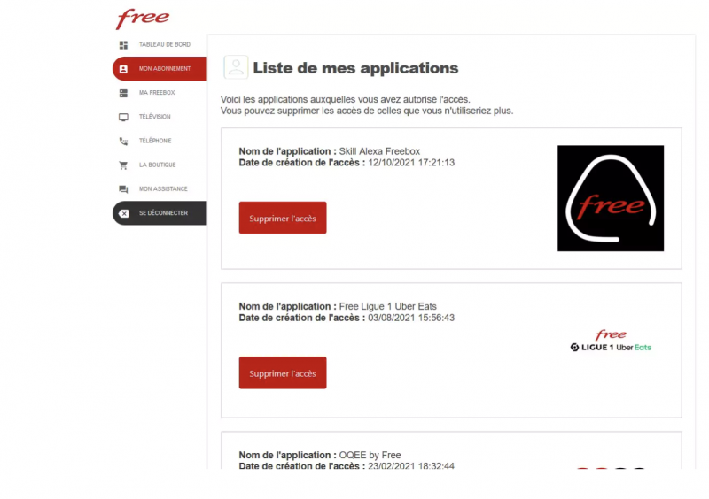 Pratique et utile. Free permet depuis fin décembre 2021 à ses abonnés Freebox d’accéder aux applications auxquelles ils ont autorisé l’accès, comme par exemple Free Ligue 1 Uber Eats, OQee, myCanal ou la Skill Alexa Freebox. “Vous pouvez supprimer les accès de celles que vous n’utiliseriez plus”, indique l’opérateur. Pour accéder à cette rubrique, il suffit de se rendre sur son espace abonné, puis dans la catégorie “Mon abonnement” et “Mes informations personnelles”, de cliquer sur “Liste de mes applications.” Tout est répertorié, l’accès sera supprimé en un simple clic.