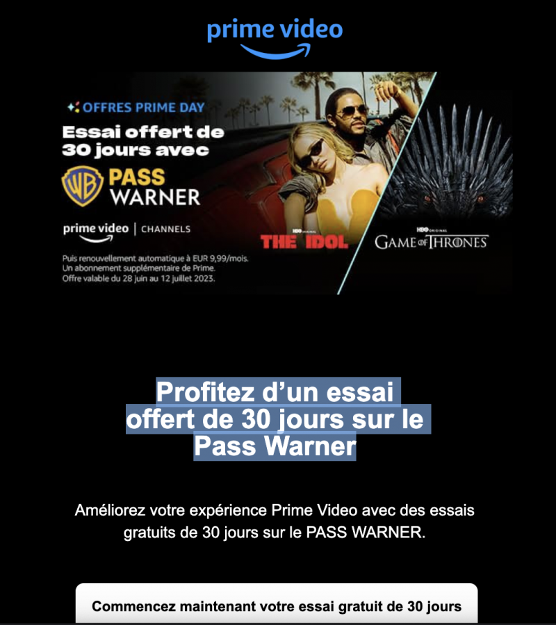 Autant en profiter puisque c’est gratuit. En marge de son Prime Day le mois prochain, Amazon annonce par mail à ses abonnés Prime qu’ils bénéficient dès aujourd’hui de 30 jours offerts sur le Pass Warner (puis 9,99€/mois sans engagement).