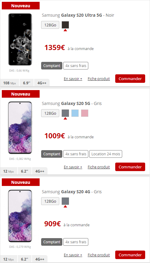 S20 5G (253 euros, puis 3 fois 252 euros)
