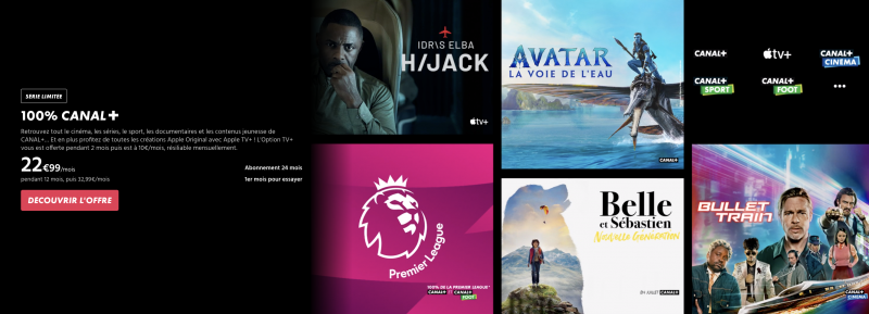Du 4 juillet au 9 août, la filiale de Vivendi lance son offre 100% Canal+. Celle-ci permet 2 utilisateurs simultanés et comprend l’accès à 9 chaînes, à savoir Canal+, Canal+ Sport, Foot, Sport 360, Cinéma, Grand Ecran, Docs, Kids et Séries pour 22,99 €/mois pendant 12 mois puis 32,99€ avec un engagement de 24 mois.