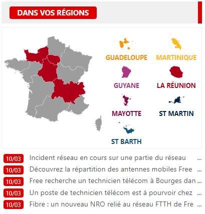 L’actualité des régions est également disponible depuis toutes les pages d’Univers Freebox, dans la sidebar de droite. A chaque nouvel article publié, la région se colore en rouge sur la carte :