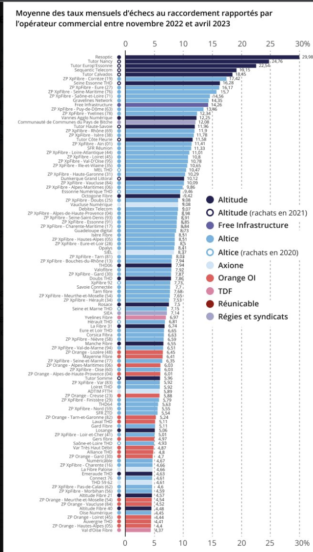 Deuxième visé, Altice (XP Fibre) compte pléthore de réseaux donc les échecs de raccordement sont trop nombreux, notamment en Corrèze, dans l’Eure et la Seine-Maritime. Orange apparaît comme le meilleur élève de la classe.