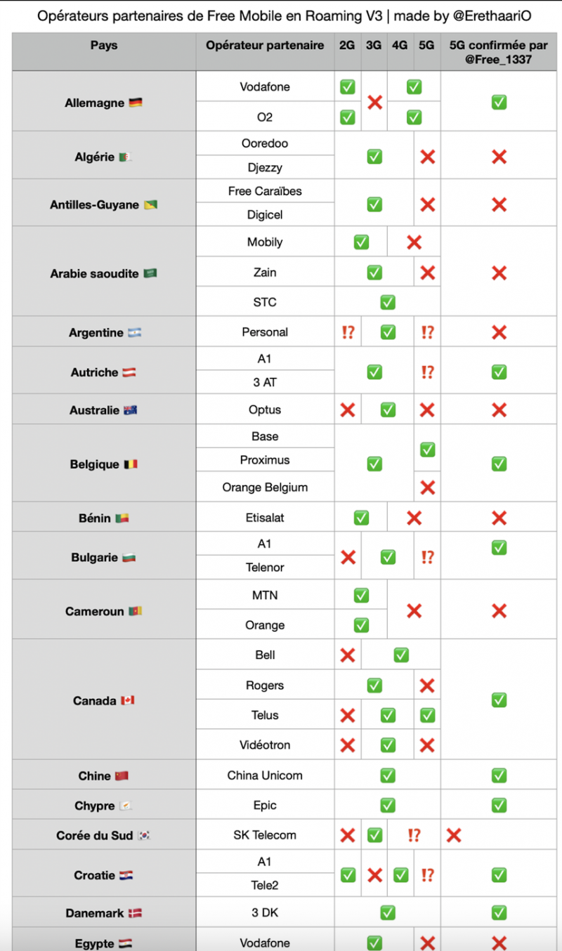 Un membre actif de la communauté Free dévoile une nouvelle liste non officielle des réseaux 4G et 5G partenaires de Free Mobile dans de nombreux pays aux quatre coins du monde. Utile avant de partir en vacances.