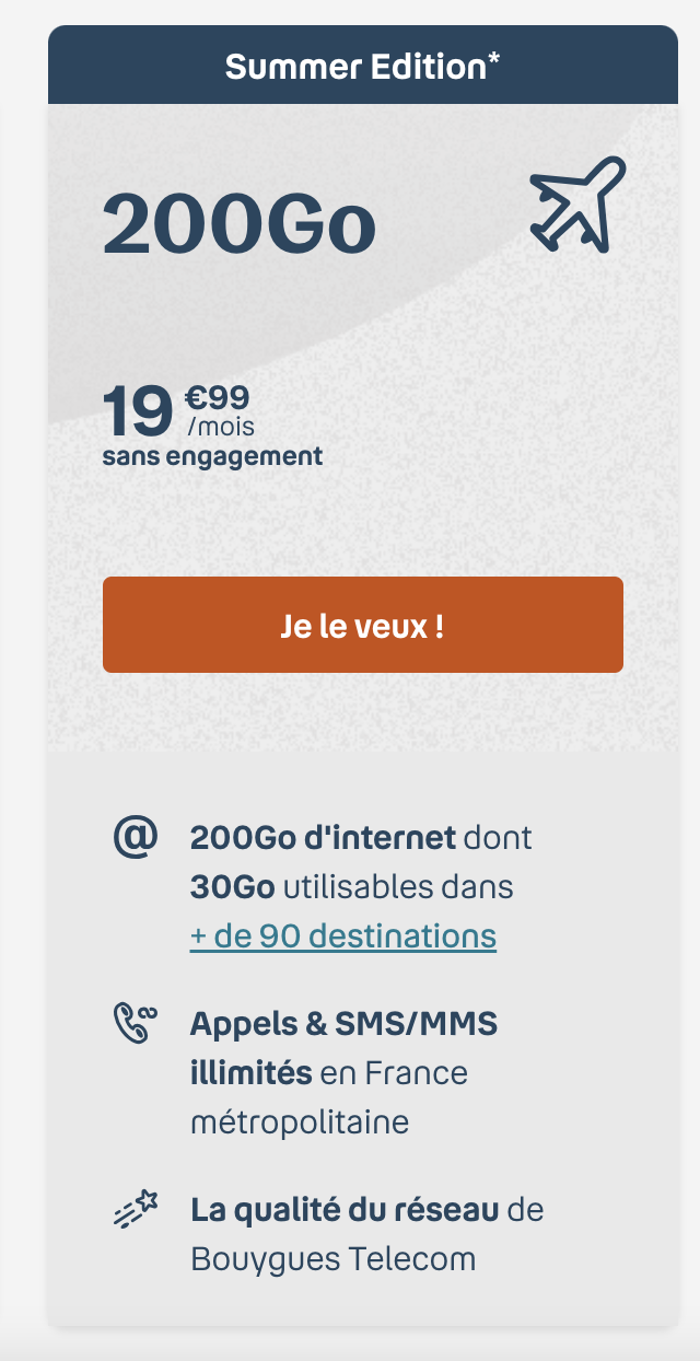 Afin de rivaliser avec Free Mobile, l’opérateur dégaine un nouveau forfait “Summer Edition” à 19,99€/mois également. L’offre inclut 200 Go en France métropolitaine tout comme le forfait mobile Free mais aussi 30 Go de data à l”étranger, soit 5 de plus que l’offre concurrente visée. Et pour faire la différence, Bouygues Telecom met le paquet sur les destinations incluses, “plus de 90”, soit environ 20 de plus que Free Mobile, sur le papier en tout cas.