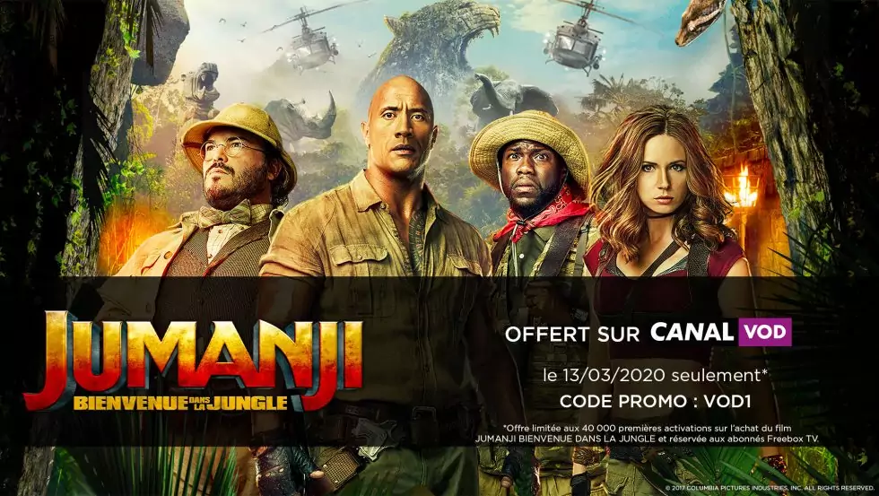 Le film Jumanji : Bienvenue dans la jungle est offert sur Canal VOD pour les 40 000 premiers abonnés Freebox qui saisiront le code VOD1. Vous pouvez dès à présent vous rendre sur l’espace Canal VOD de votre Freebox, sélectionner le film Jumanji puis choisir la qualité HD ou SD. Un bouton indiquant “Code promo” se trouve sous la liste, il suffit donc d’y rentrer le code promo VOD1, puis le film passe alors en “offert” au lieu de 9€ ou 7€ selon la qualité demandée.