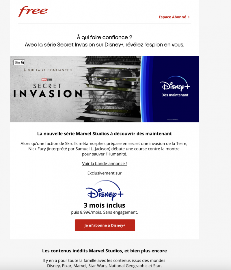 Après avoir offert à plusieurs reprises pendant 6 mois Disney+ aux nouveaux abonnés mais aussi aux clients existants disposant d’une Freebox Pop et Delta (Player Pop/ Devialet), Free a revu à la baisse son offre cette année. Aujourd’hui, le FAI met en avant Secret Invasion, la nouvelle série Marvel Studios à découvrir dès maintenant sur la plateforme du géant américain, laquelle propose également dans son catalogue les contenus issus des mondes Disney, Pixar, Star Wars, National Geographic et Star.