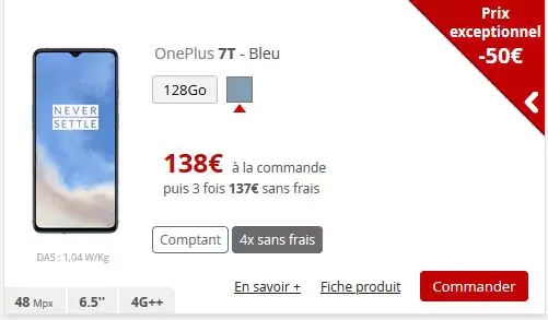 Le OnePlus 7T voit son prix baisser exceptionnellement de 50€ dans la boutique en ligne de Free. Ainsi, son tarif passe à 549€ contre 599€ initialement. La réduction s’applique également lors d’une commande en 4 fois sans frais, avec un premier versement de 138€ à la commande puis trois fois 137€ sans frais.