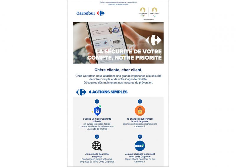 Alors que des témoignages comme celui cité plus haut se répandent de plus en plus, Carrefour a lancé une campagne de prévention par email. Ce dernier rappelle les bons réflexes à adopter comme changer régulièrement de mot de passe, mais aussi choisir un code secret solide (évitez à tout prix votre date de naissance).