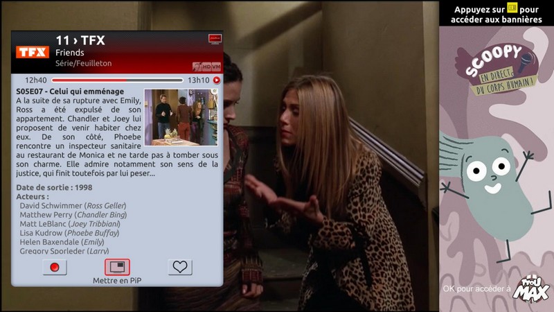 En appuyant sur le bouton OK au centre de la croix multidirectionnelle de votre télécommande, vous accéderez à plusieurs options, dont “Mettre en PiP”. Le programme se loge dans le coin de l’écran.