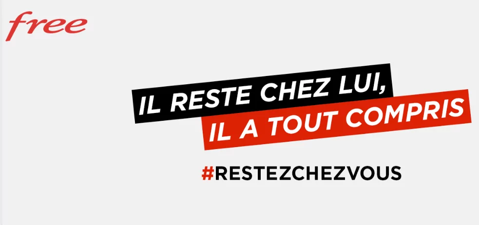 A partir de ce mardi midi, les français seront pour la plupart confinés chez eux, ainsi que l’a annoncé le Président de la République lundi soir. Un mot d’ordre : restez chez vous, afin de ne pas prendre de risques pour vous mais également pour vos proches. Free s’est saisi de ce mot d’ordre en l’adaptant à son slogan historique et publie sur Twitter la consigne “Il reste chez lui, il a tout compris”. Une bannière que l’opérateur arbore dorénavant sur son compte Twitter ou Facebook