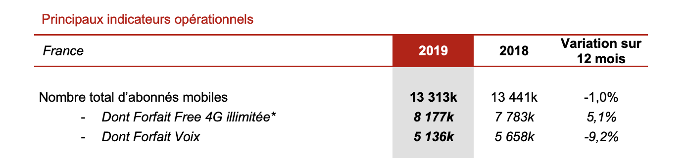 Sur l’année 2019, l’opérateur a toutefois vu partir 128 000 abonnés à la concurrence, la faute à son talon d’Achille, son forfait 2€. Mais motif de satisfaction, l’opérateur réussit sa montée en gamme progressive avec 394 000 recrutements nets sur ses offres 4G, soit près de 8,2 millions d’abonnés à fin décembre. L’ARPU mobile facturé aux abonnés est en hausse de 11% en un an, à 10,2 euros en moyenne en 2019,.