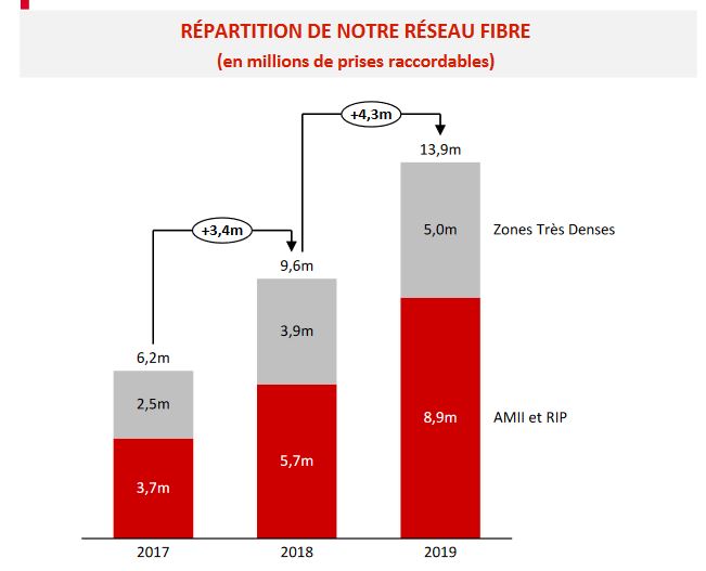 En Zone Très Dense, c’est-à-dire la partie du territoire où la concentration de population est telle qu’il est viable que plusieurs opérateurs déploie leur propre réseau de fibre optique, Free comptait à la fin de l’année 2019 5 millions de prises raccordables, contre 3,9 millions en 2018. Une augmentation donc assez nette, avec 1.1 million de nouvelles prises raccordables en un an.