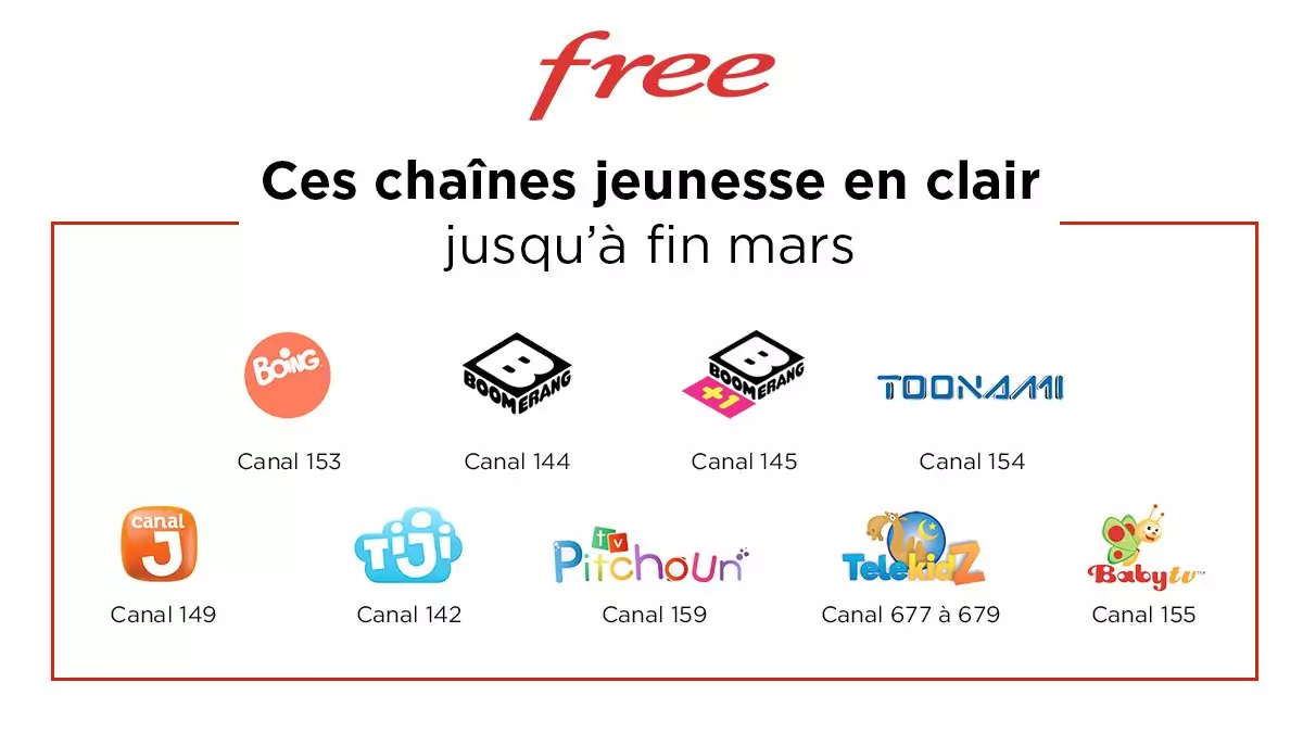 Après la mise en clair hier des chaînes Canal+, Free annonce ce matin offrir l’accès à 8 chaînes jeunesse et un bouquet TV à ses abonnés Freebox jusqu’à fin mars.