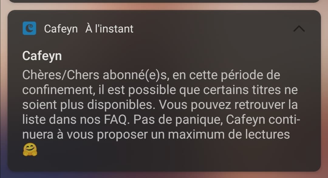Ainsi, les détenteurs de l’application Cafeyn ont pu recevoir une notification les informant que certains titres n’étaient plus disponibles en cette période de confinement. Pour avoir la liste complète et mise à jour, il faut se rendre dans la FAQ du site.