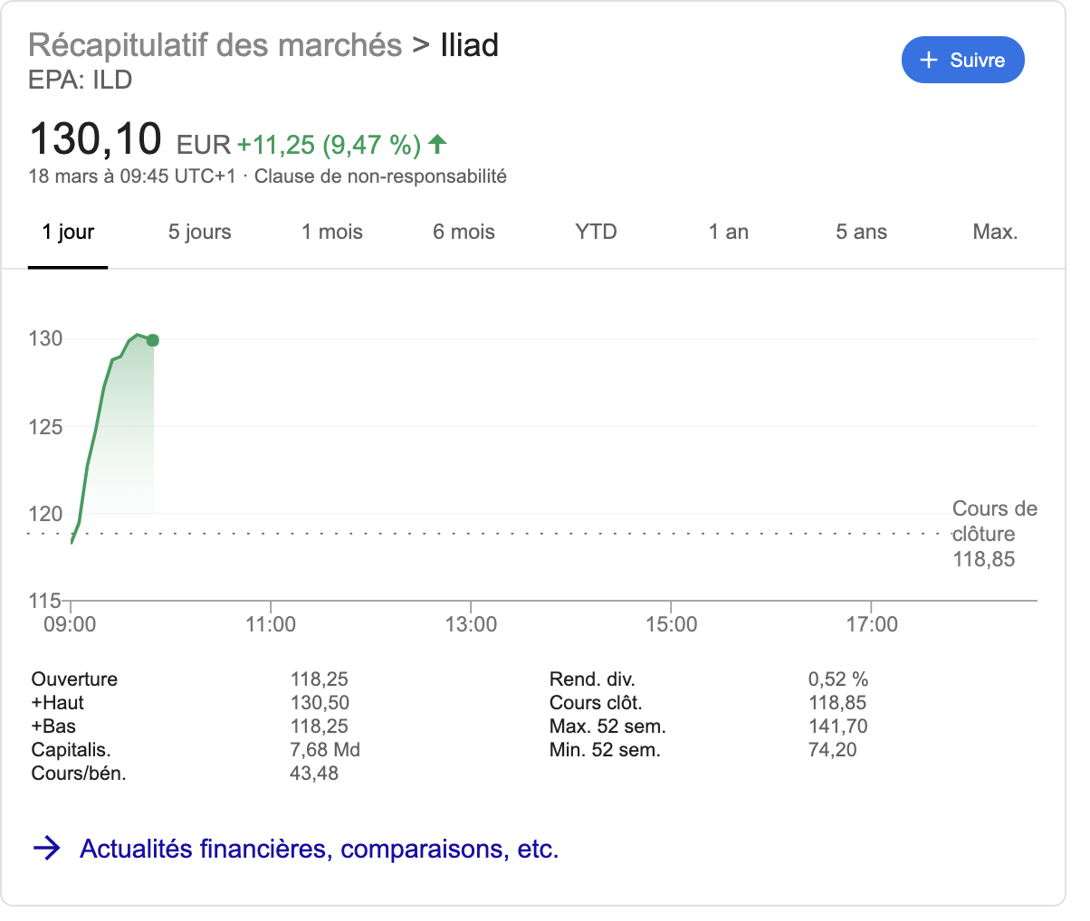 Les performances financières et commerciales d’Iliad s’en ressentent très positivement en Bourse. Le titre du groupe a bondi de près de 20% hier et continue sur sa lancée ce matin (+9,47%).