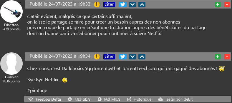 Alors que certains pensaient que la mise en place de la fin du partage de compte allait plomber Netflix, finalement, il n’en est rien. En effet, la mise en place de la fin du partage de compte apporte du positif à Netflix. La plateforme de streaming américaine ainsi dévoilé les résultats du second trimestre 2023 qui sont dans le vert, avec 238 millions d’abonnés dans le monde, soit 5.98 millions de nouveaux clients sur les trois derniers mois. Si certains se retournent vers le piratage face aux décisions de Netflix, ils ne sont, semble-t-il, pas une majorité.