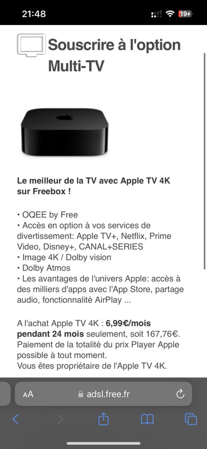 Mais selon vos témoignage, il est de nouveau possible de souscrire à cette offre, alors que depuis des mois il était indiqué qu’elle était indisponible. L’offre reste la même, c’est à dire que le boitier TV d’Apple est proposé à 6,99€/mois pendant 24 mois (soit 167,76€ ) pour les abonnés souhaitant se l’offrir en tant que Player secondaire et en devenir propriétaires. Pour en bénéficier, il suffit de vous rendre sur votre espace abonné Freebox. Mais si vous êtes intéressés, dépêchez vous, ce ne restera peut être pas disponible longtemps.