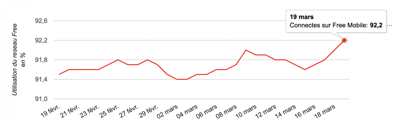 En ce début de période de confinement et à l’heure où les déplacements sont limités au maximum, le taux d’utilisation du réseau Free Mobile progresse et atteint aujourd’hui un nouveau pic. Les abonnés utilisant l’application Free Mobile Netstat sont actuellement connectés 92,2% du temps au réseau propre de l’opérateur, un nouveau record, le précédent datant du 8 mars dernier. Dans le même temps, le réseau d’Orange en itinérance 3G n’a jamais été aussi peu utilisé, seulement 7,8% du temps. De bon augure seulement 10 mois avant la fin du contrat liant les deux opérateurs.
