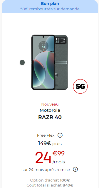 Le Motorola RAZR 40 est disponible en paiement comptant 899€ (soit 849€ une fois l’ODR déduite pour les nouveaux abonnés, et 869€ pour les déjà abonnés)