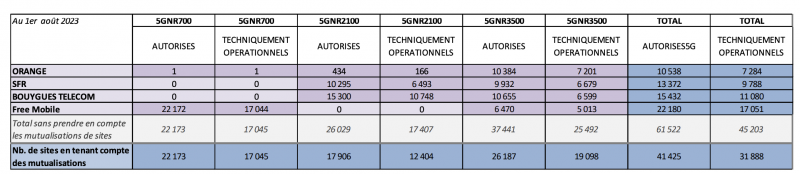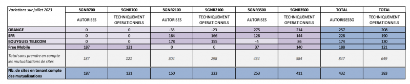 L’ANFR a dévoilé hier son observatoire mensuel du déploiement des réseaux 5G d’Orange, Free, SFR et Bouygues Telecom pour le mois de juillet 2023. En tenant compte des mutualisations, au premier août, 32 108 sites 5G sont déclarés techniquement opérationnels par les opérateurs de téléphonie mobile. La quasi-totalité de ces implantations 5G sont autorisées sur des sites existants, déjà utilisés par les technologies 2G, 3G ou 4G, seuls 7 supports n’hébergent que de la 5G.