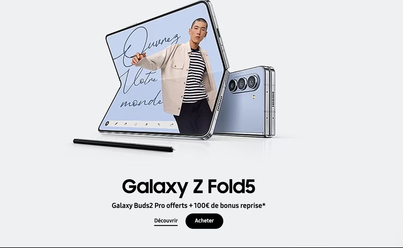 Si vous souhaitez conserver un format smartphone et simplement être capable de réduire sa taille, vous pouvez opter pour le Galaxy Z Flip5. Il est proposé dans plusieurs coloris (crème, graphite, lavande, vert d’eau) avec au choix 256 Go et 512 Go de stockage. Un bonus reprise de 100€ est proposé ainsi qu’une offre de remboursement de 60€ après achat. Pour couronner le tout, une paire de Galaxy Buds2 Pro est offerte pour l’achat d’un modèle d’ici le 30 septembre prochain.