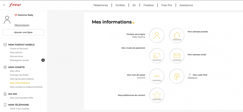 Pour la troisième solution, il faut passer par l’espace abonné Free Mobile accessible à l’adresse https://mobile.free.fr/. Une fois connectés avec vos identifiants, allez dans “Mon compte”, puis “Mes informations”. De là, cliquez sur “mon code PUK”. Celui-ci s’affichera directement, composé alors de huit chiffres.