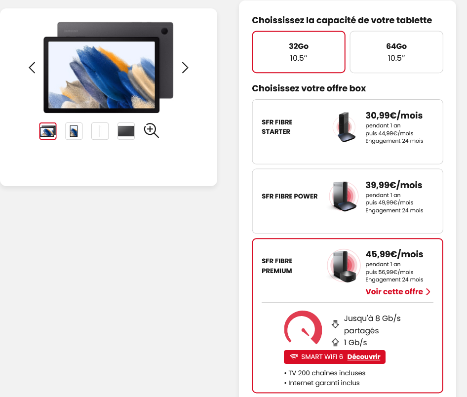 Comme souvent avec ce type d’offres de SFR, les tarifs varient selon la combinaison choisie. Ainsi, la tablette 32 Go coûte 29€ avec l’offre Starter (500Mb/s, WiFi 5, 160 chaînes), 9€ avec l’offre Power (WiFi 6, jusqu’à 2Gb/s en download, 200 chaînes) et 1€ avec la version Premium (Jusqu’à 8Gb/s partagé, WiFi 6, 200 chaînes incluses, 9 mois offerts à Netflix avec pub ou Amazon prime). Le prix de la version 64Go varie pour sa part entre 29 et 59€.