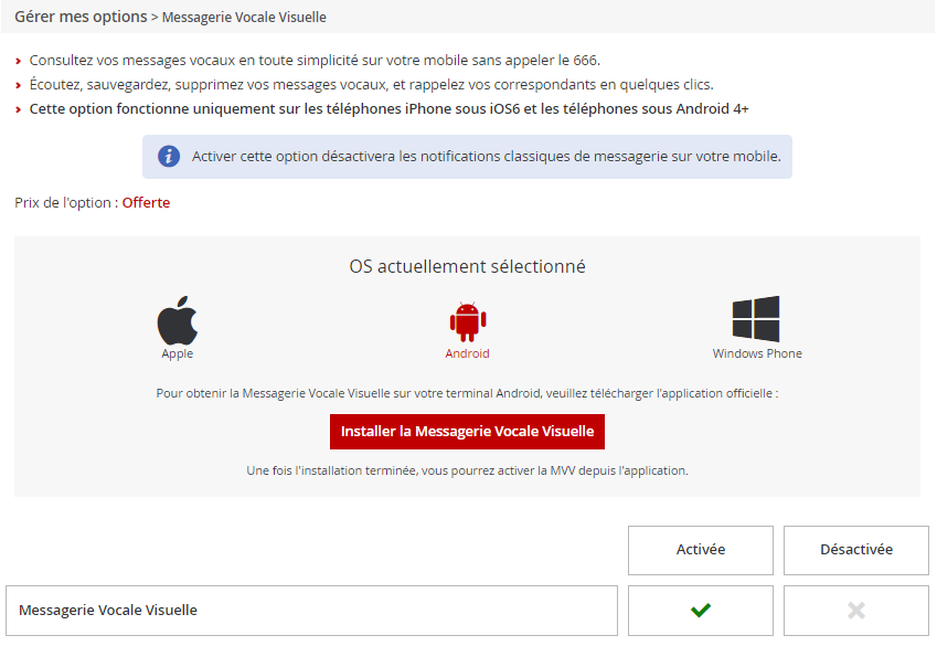 L’option peut maintenant être activée via l’espace abonné en ligne, sur le site de free.re, section > Mes options, il faudra ensuite activer l’option puis choisir l’OS de son mobile.