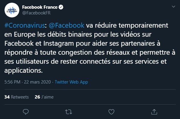 Dans un communiqué Facebook explique : « Pour aider à limiter toute congestion potentielle du réseau, nous allons réduire temporairement les débits binaires pour les vidéos sur Facebook et Instagram en Europe ».