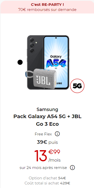 Promo Pack Samsung A54 5G + JBL GO 3 ECO pour les nouveaux abonnés avec une ODR de 70€ :