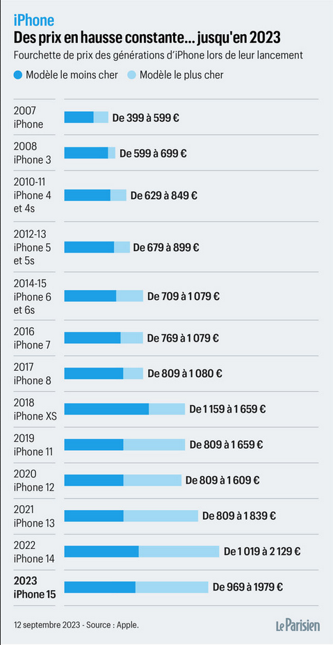Première surprise : pour la première fois, ces modèles sont globalement moins chers que les iPhone 14 avec des différences allant de 100 à 50€ selon les versions et la quantité de stockage disponible.