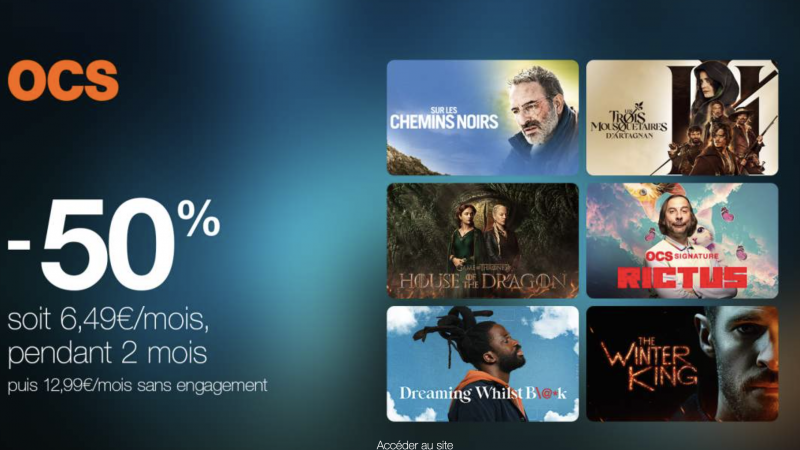 Le meilleur du cinéma 6 mois après la sortie en salles, des séries inédites de MGM, NBCUniversal et encore un peu de HBO, l’abonnement à OCS est affiché à moins 50% pendant 2 mois.