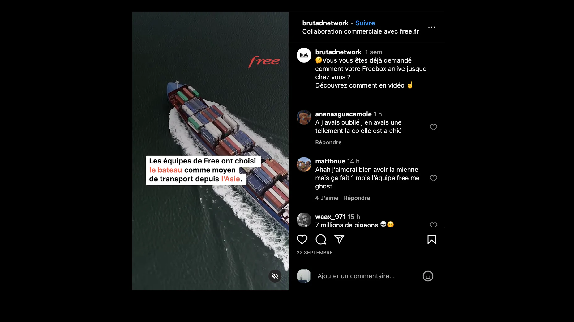 Dans une vidéo sponsorisée, Brut revient sur le chemin emprunté par les Freebox de leur point de départ en Asie par voie maritime à leur arrivée chez vous. L’opérateur n’aime pas l’avion ni les camions. Il estime réaliser plusieurs dizaines de milliers de km par an d’économie sur le transport routier. Son objectif est de réduire au maximum l’empreinte carbone.