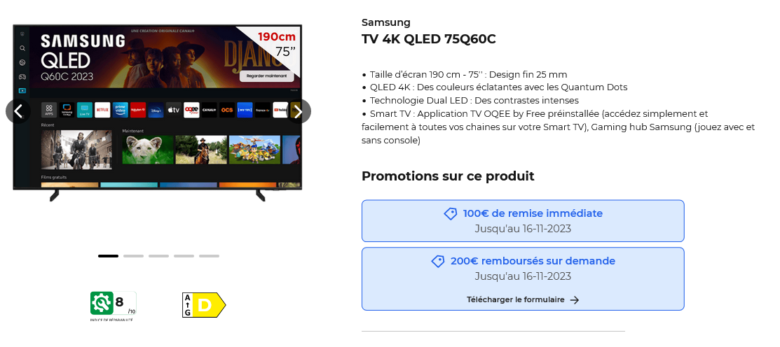 L’un des modèles, celui de 75 pouces, bénéficie également d’une remise immédiate de 100€, portant à 300€ le montant économisé si vous faites la demande de remboursement. Pour ce modèle, il faudra ainsi compter 619€ à la commande puis 25.99€/mois pendant 30 mois avec la possibilité de finaliser le paiement à tout moment. L’offre de remboursement fonctionne sur demande, comme indiquée dans la brochure disponible sur l’espace abonné.
