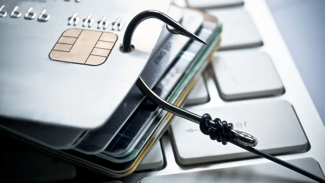 Phishing - a credit card with a fish hook trying to steal personal data on a computer keyboard / financial data theft