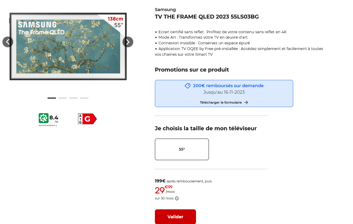 Il est actuellement proposé une offre de remboursement de 200€ sur ce modèle, qui affiche un prix de 1299€ au total. Si vous êtes séduit, il faudra régler 399€ à la commande, puis 29.99€/mois pendant trente mois. Pour bénéficier de l’ODR, valable pour tout achat du modèle jusqu’au 16 novembre, il suffit de suivre la procédure expliquée dans cette brochure. Une autre offre de remboursement est proposée en ce moment sur la gamme QLED disponible dans la boutique dédiée aux abonnés Freebox.