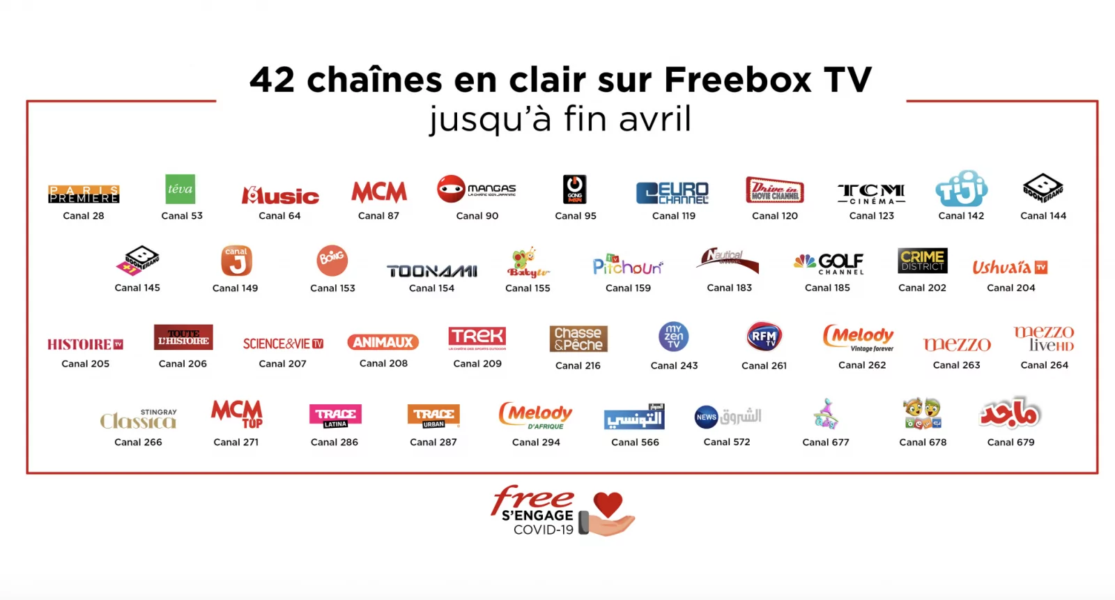 Cinéma, musique, jeunesse et divertissement, comme annoncé hier, Free offre de nouvelles chaînes à ses abonnés Freebox et en prolonge d’autres. C’est aujourd’hui officiel, 42 canaux sont dès à présent en clair sur Freebox TV, jusqu’au 30 avril.